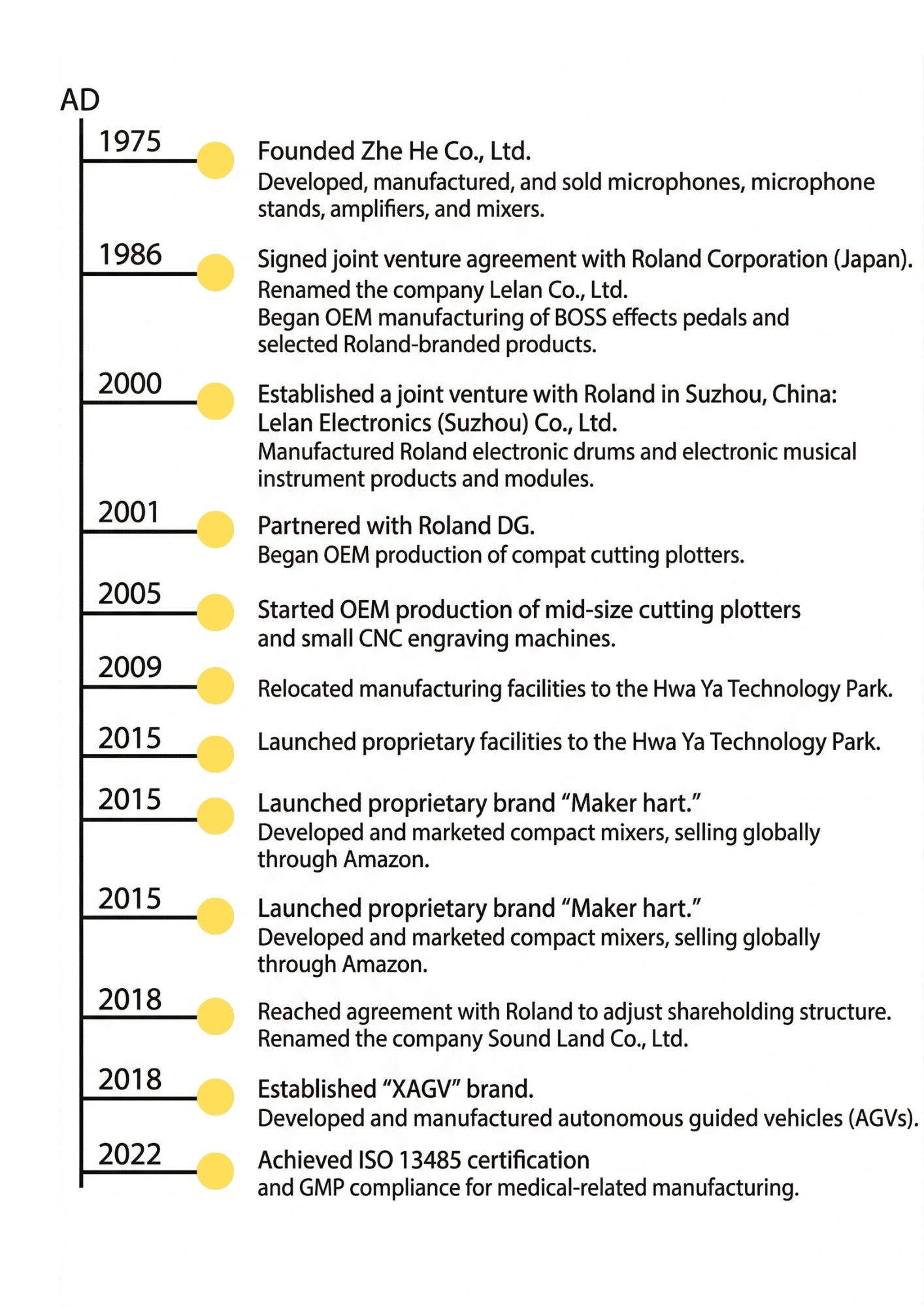 Beginning in 2001, the company expanded into precision equipment OEM manufacturing for Roland DG, producing computer cutting plotters, 3D engraving machines, and NC machining equipment. In 2015, Sound Land launched its own brand, Maker hart, with products marketed worldwide. In 2018, the company transitioned into an independent professional electronics OEM manufacturer, further expanding into diversified electronic product categories, including industrial computer peripherals and Bluetooth active noise-canceling headphones.